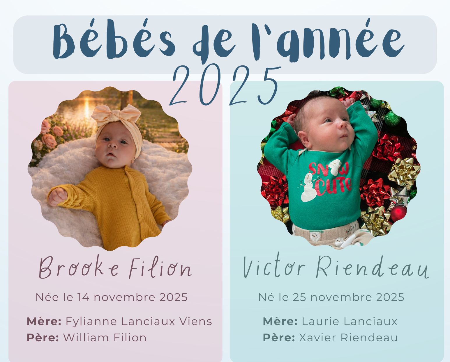 Chaque année, le journal municipal publie les photos des nouveau-nés de la municipalité afin de les présenter à la communauté. Si vous êtes parents d’un nouveau-né, c'est avec plaisir que nous publierons sa photo.